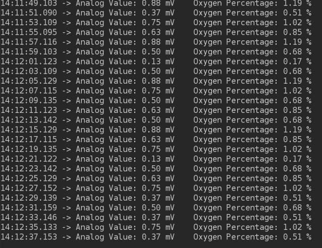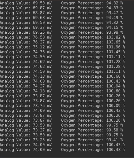 These readings are in mV which will be converted to Oxygen percent and displayed to OLED over I2C channel.