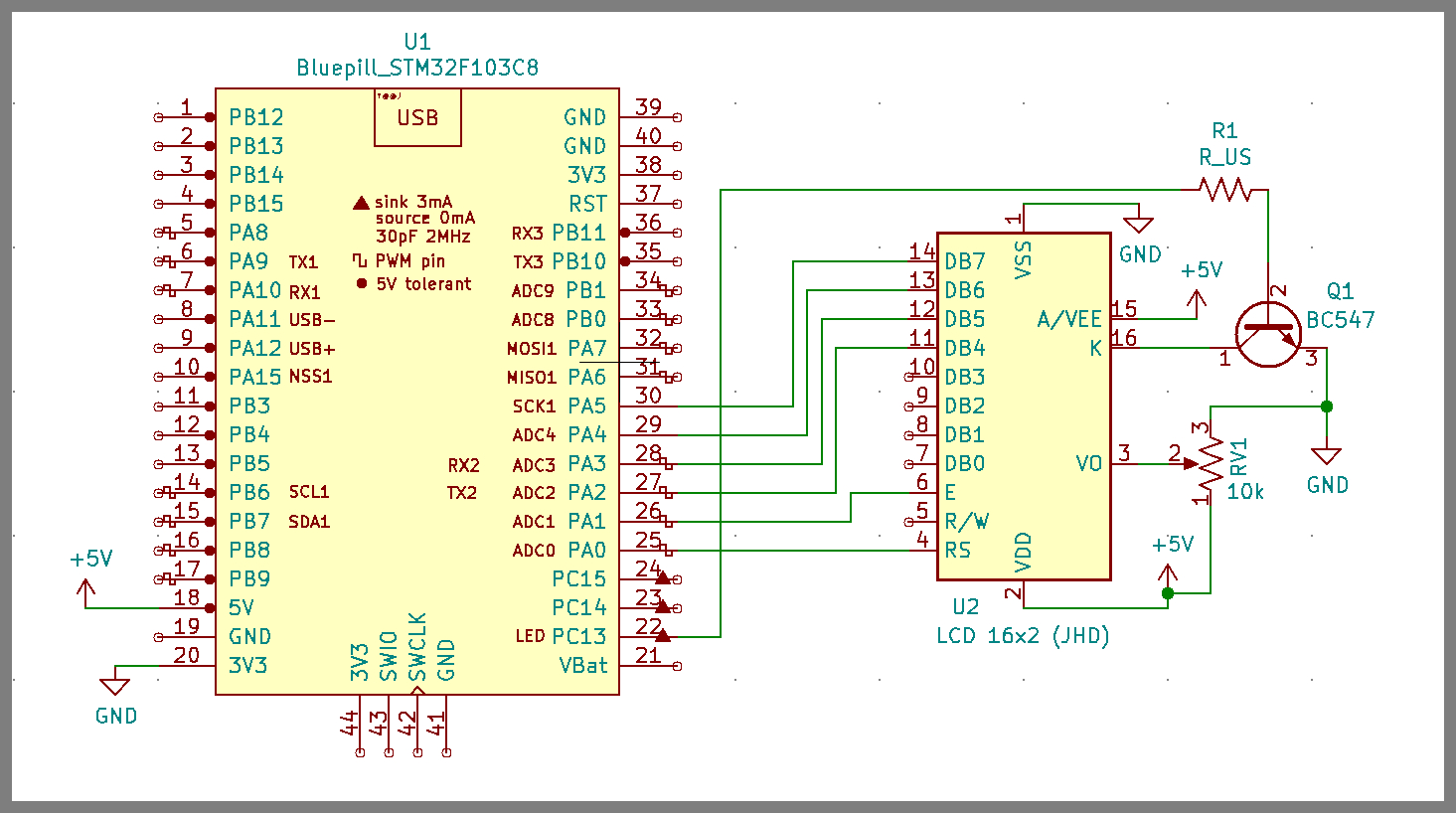 Backlit Anode pin is connected to 5v and Cathode is connected to collector BC547 (NPN) transitor, Emiiter of transistor is grounded and the base of transistor is connected to PC13 to switch ON and OFF the backlit.
